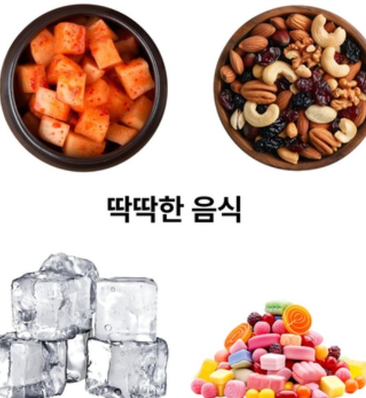 딱딱한 음식 : 견과류, 사탕, 얼음, 마른 오징어, 깍두기